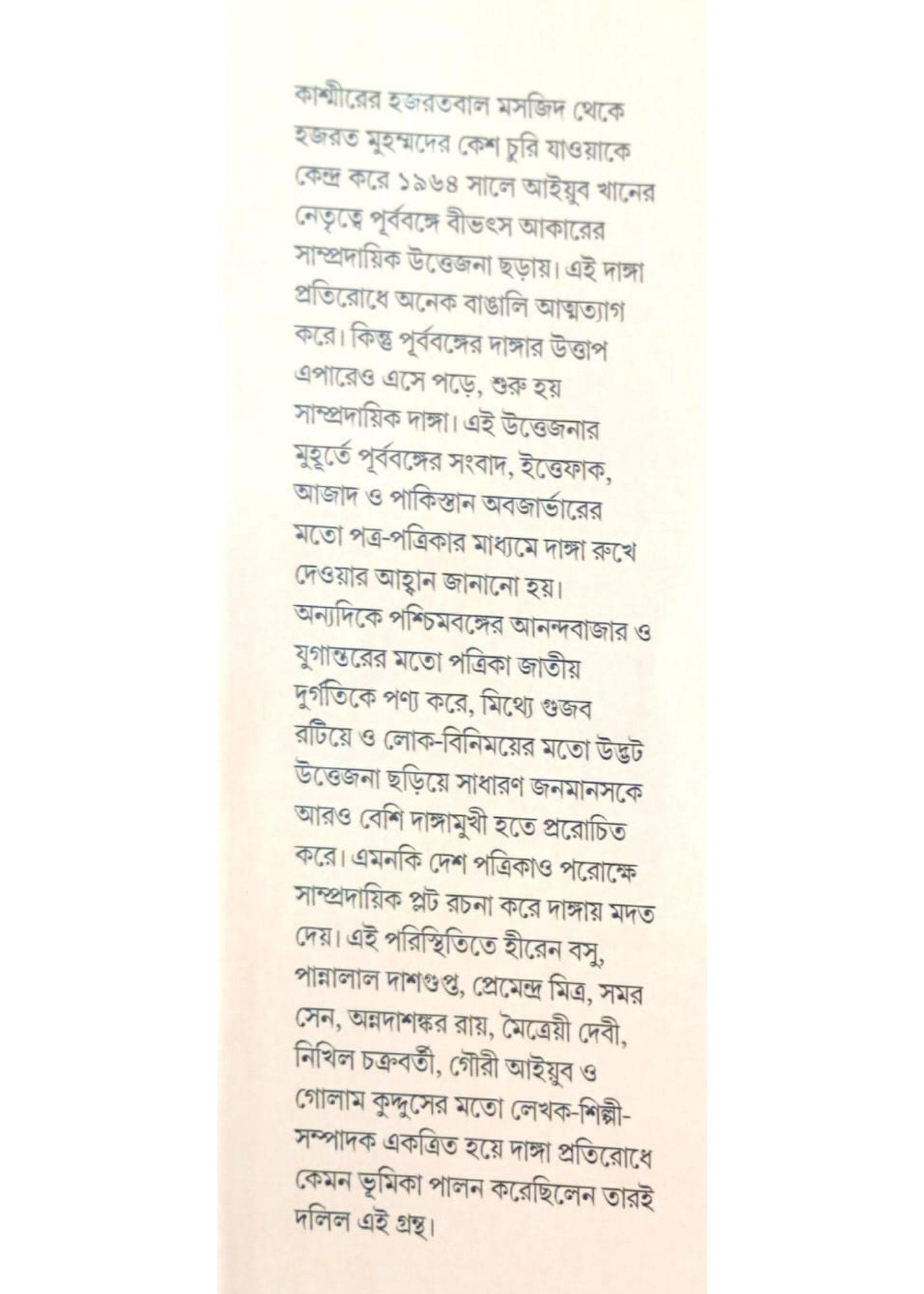 কাশ্মীরের হজরতবাল মসজিদ থেকে হজরত মুহম্মদের কেশ চুরি যাওয়াকে কেন্দ্র করে ১৯৬৪ সালে আইয়ুব খানের নেতৃত্বে পূর্ববঙ্গে বীভৎস আকারের সাম্প্রদায়িক উত্তেজনা ছড়ায়। এই দাঙ্গা প্রতিরোধে অনেক বাঙালি আত্মত্যাগ করে। কিন্তু পূর্ববঙ্গের দাঙ্গার উত্তাপ এপারেও এসে পড়ে, শুরু হয় সাম্প্রদায়িক দাঙ্গা। এই উত্তেজনার মুহূর্তে পূর্ববঙ্গের সংবাদ, ইত্তেফাক, আজাদ ও পাকিস্তান অবজার্ভারের মতো পত্র-পত্রিকার মাধ্যমে দাঙ্গা রুখে দেওয়ার আহ্বান জানানো হয়। অন্যদিকে পশ্চিমবঙ্গের আনন্দবাজার ও যুগান্তরের মতো পত্রিকা জাতীয় দুর্গতিকে পণ্য করে, মিথ্যে গুজব রটিয়ে ও লোক-বিনিময়ের মতো উদ্ভট উত্তেজনা ছড়িয়ে সাধারণ জনমানসকে আরও বেশি দাঙ্গামুখী হতে প্ররোচিত করে। এমনকি দেশ পত্রিকাও পরোক্ষে সাম্প্রদায়িক প্লট রচনা করে দাঙ্গায় মদত। দেয়। এই পরিস্থিতিতে হীরেন বসু, পান্নালাল দাশগুপ্ত, প্রেমেন্দ্র মিত্র, সমর সেন, অন্নদাশঙ্কর রায়, মৈত্রেয়ী দেবী, নিখিল চক্রবর্তী, গৌরী আইয়ুব ও গোলাম কুদ্দুসের মতো লেখক-শিল্পী-সম্পাদক একত্রিত হয়ে দাঙ্গা প্রতিরোধে কেমন ভূমিকা পালন করেছিলেন তারই দলিল এই গ্রন্থ।