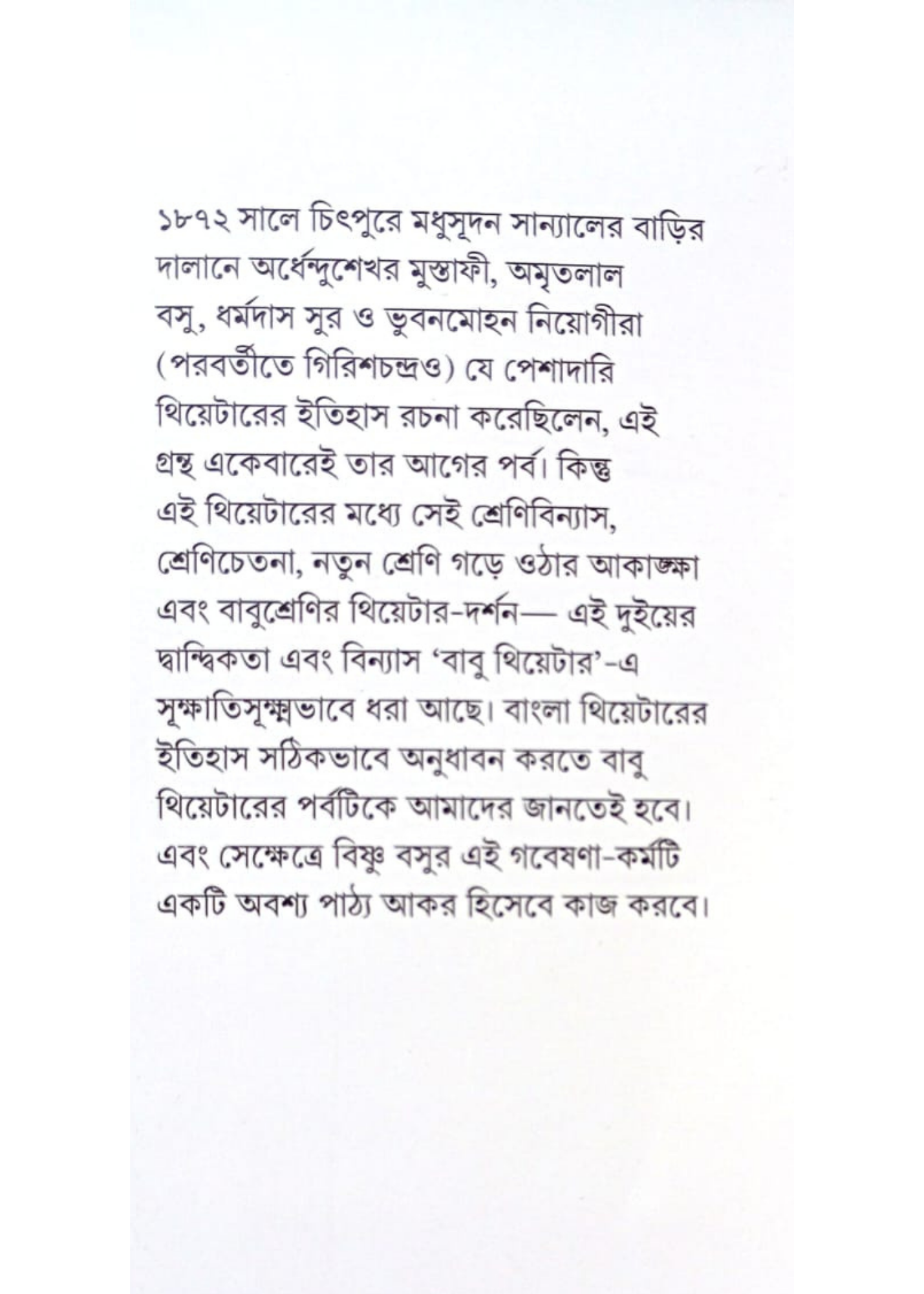 ১৮৭২ সালে চিৎপুরে মধুসূদন সান্যালের বাড়ির দালানে অর্ধেন্দুশেখর মুস্তাফী, অমৃতলাল বসু, ধর্মদাস সুর ও ভুবনমোহন নিয়োগীরা (পরবর্তীতে গিরিশচন্দ্রও) যে পেশাদারি থিয়েটারের ইতিহাস রচনা করেছিলেন, এই গ্রন্থ একেবারেই তার আগের পর্ব। কিন্তু এই থিয়েটারের মধ্যে সেই শ্রেণিবিন্যাস, শ্রেণিচেতনা, নতুন শ্রেণি গড়ে ওঠার আকাঙ্ক্ষা এবং বাবুশ্রেণির থিয়েটার-দর্শন- এই দুইয়ের দ্বান্দ্বিকতা এবং বিন্যাস 'বাবু থিয়েটার'-এ সূক্ষাতিসূক্ষ্মভাবে ধরা আছে। বাংলা থিয়েটারের ইতিহাস সঠিকভাবে অনুধাবন করতে বাবু থিয়েটারের পর্বটিকে আমাদের জানতেই হবে। এবং সেক্ষেত্রে বিষ্ণু বসুর এই গবেষণা-কর্মটি একটি অবশ্য পাঠ্য আকর হিসেবে কাজ করবে।