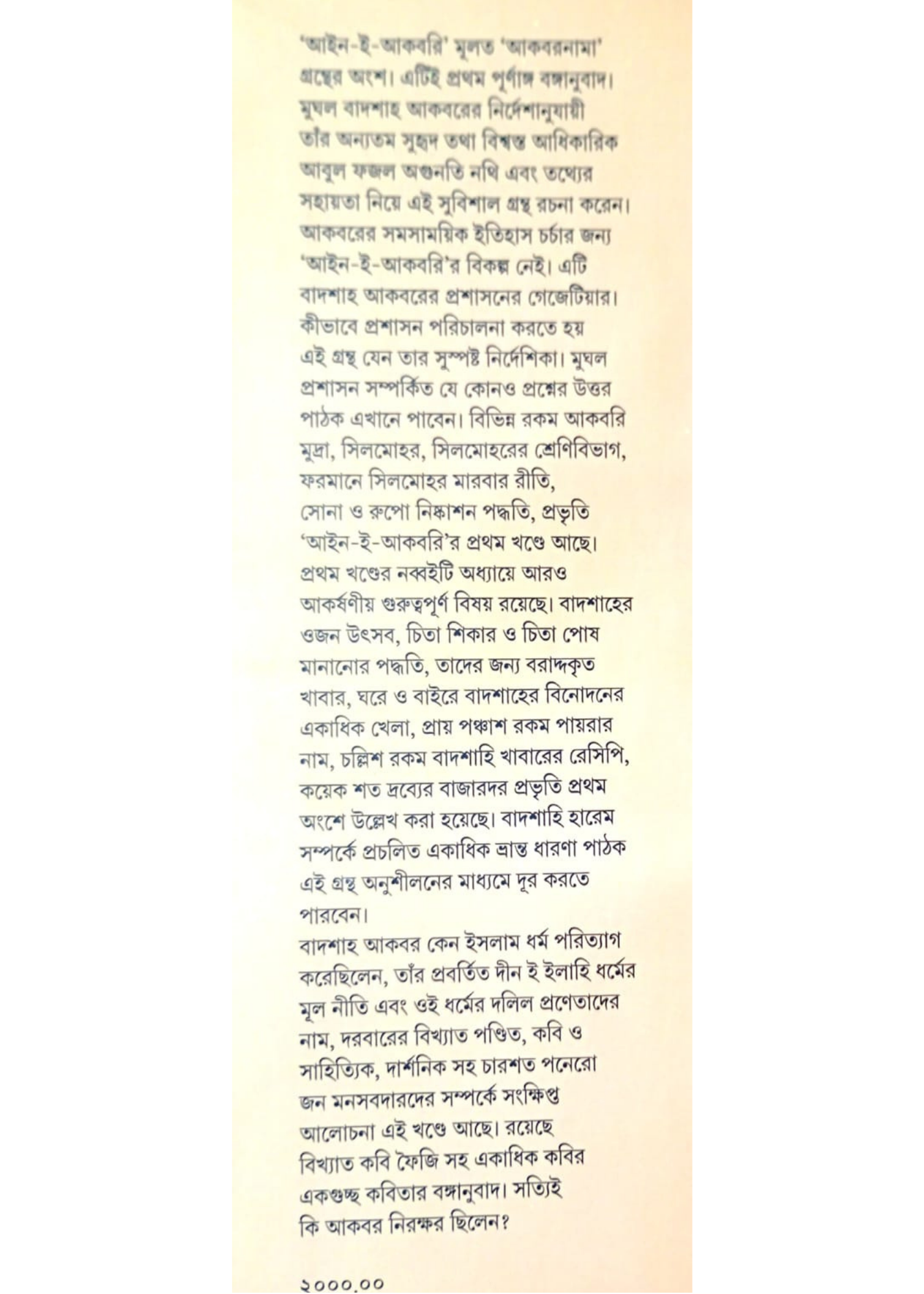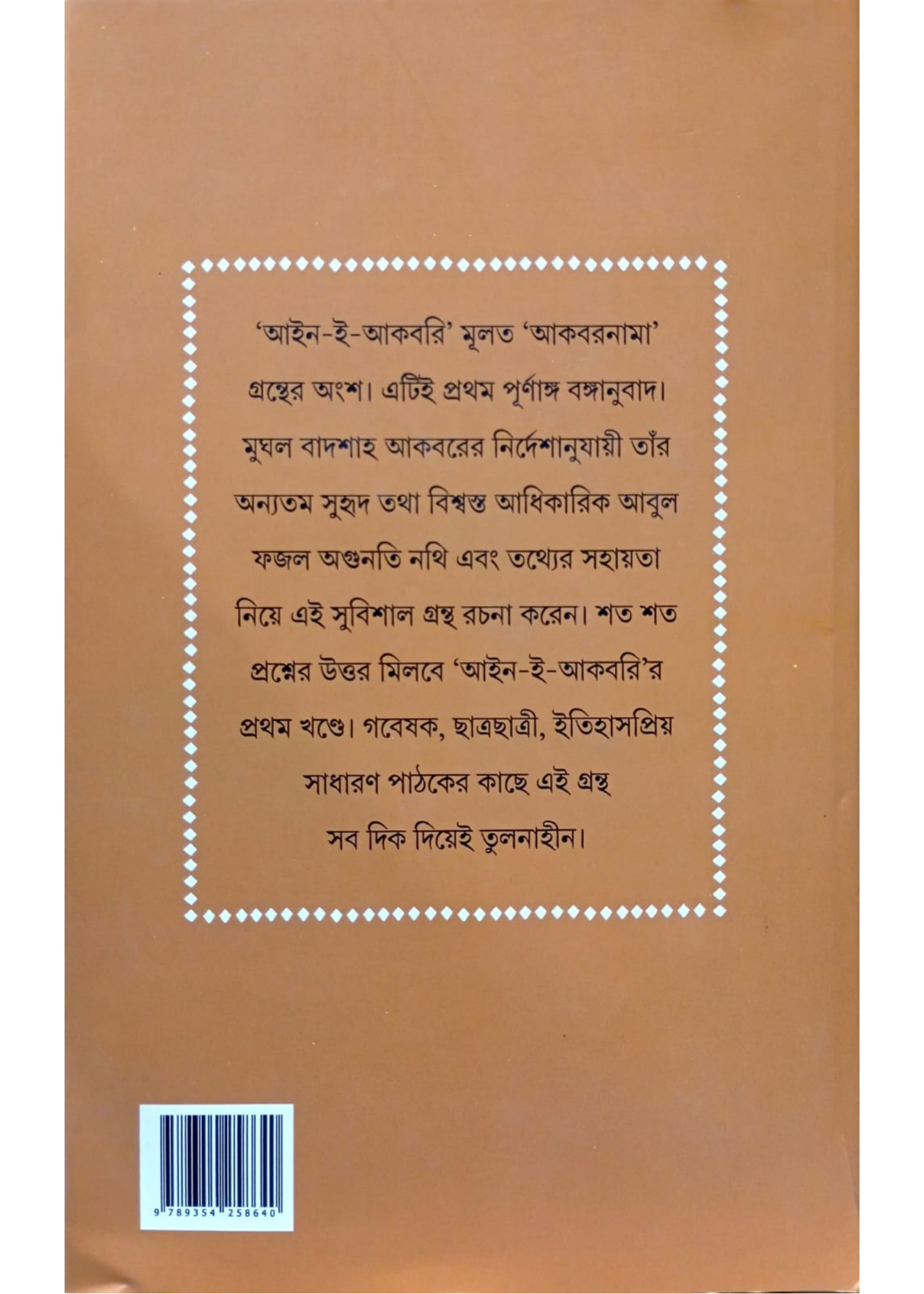 'আইন-ই-আকবরি' মূলত 'আকবরনামা' গ্রন্থের অংশ। এটিই প্রথম পূর্ণাঙ্গ বঙ্গানুবাদ। মুঘল বাদশাহ আকবরের নির্দেশানুযায়ী তাঁর অন্যতম সুহৃদ তথা বিশ্বস্ত আধিকারিক আবুল ফজল অগুনতি নথি এবং তথ্যের সহায়তা নিয়ে এই সুবিশাল গ্রন্থ রচনা করেন। শত শত প্রশ্নের উত্তর মিলবে 'আইন-ই-আকবরি'র প্রথম খণ্ডে। গবেষক, ছাত্রছাত্রী, ইতিহাসপ্রিয় সাধারণ পাঠকের কাছে এই গ্রন্থ সব দিক দিয়েই তুলনাহীন।