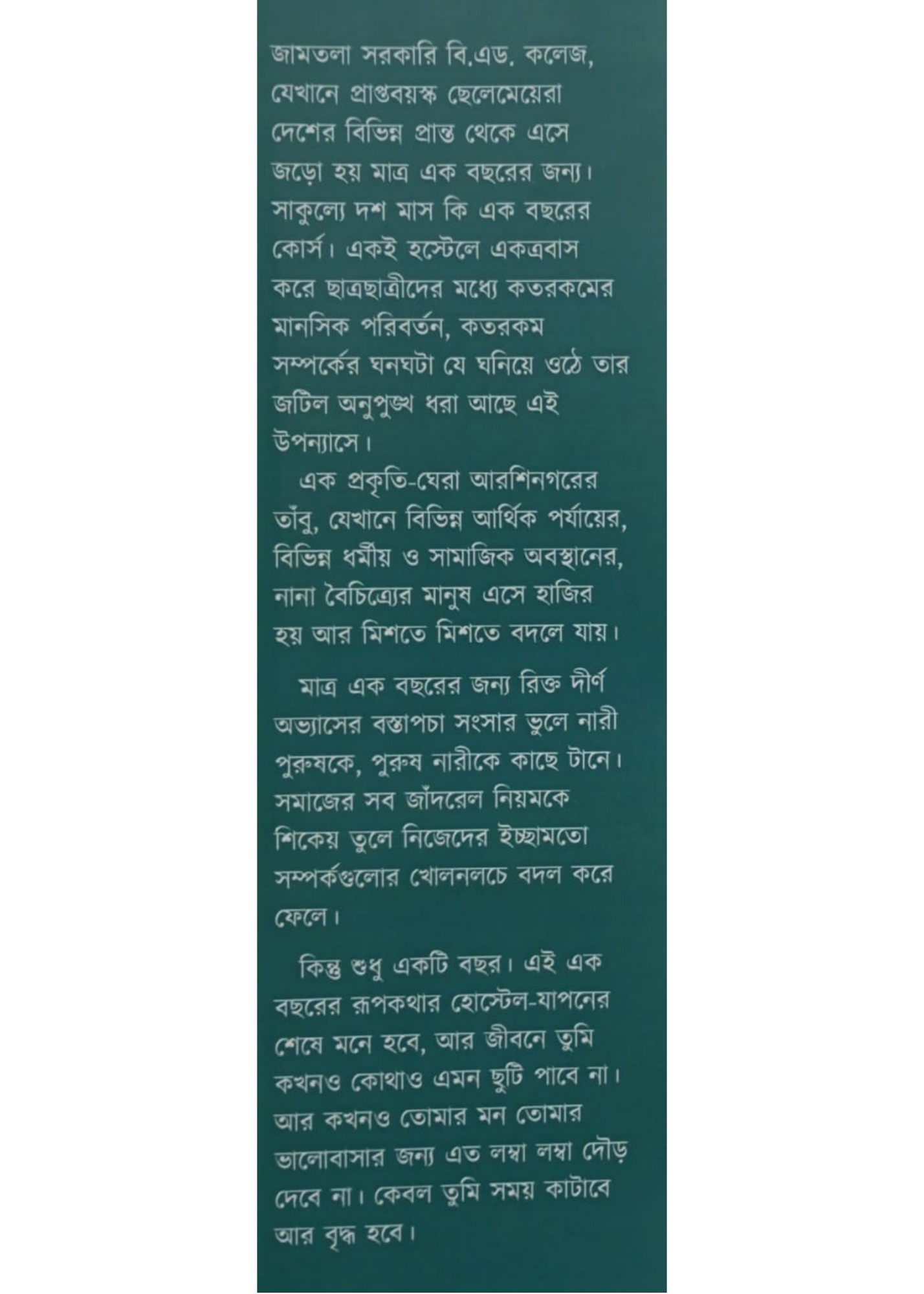 জামতলা সরকারি বি.এড. কলেজ, যেখানে প্রাপ্তবয়স্ক ছেলেমেয়েরা দেশের বিভিন্ন প্রান্ত থেকে এসে জড়ো হয় মাত্র এক বছরের জন্য। সাকুল্যে দশ মাস কি এক বছরের কোর্স। একই হস্টেলে একত্রবাস করে ছাত্রছাত্রীদের মধ্যে কতরকমের মানসিক পরিবর্তন, কতরকম সম্পর্কের ঘনঘটা যে ঘনিয়ে ওঠে তার জটিল অনুপুঙ্খ ধরা আছে এই উপন্যাসে।