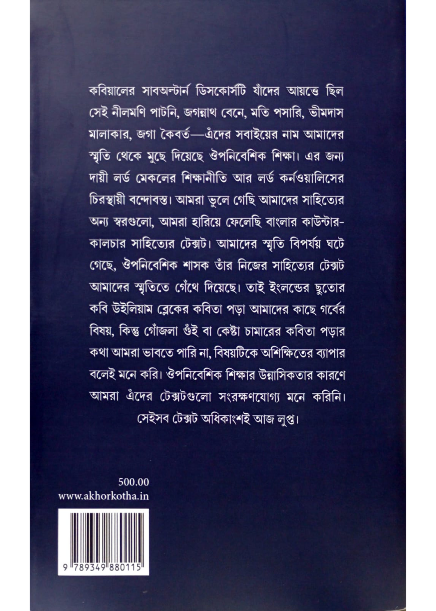 কবিয়ালের সাবঅল্টার্ন ডিসকোর্সটি যাঁদের আয়ত্তে ছিল সেই নীলমণি পাটনি, জগন্নাথ বেনে, মতি পসারি, ভীমদাস মালাকার, জগা কৈবর্ত-এঁদের সবাইয়ের নাম আমাদের স্মৃতি থেকে মুছে দিয়েছে ঔপনিবেশিক শিক্ষা। এর জন্য দায়ী লর্ড মেকলের শিক্ষানীতি আর লর্ড কর্নওয়ালিসের চিরস্থায়ী বন্দোবস্ত। আমরা ভুলে গেছি আমাদের সাহিত্যের অন্য স্বরগুলো, আমরা হারিয়ে ফেলেছি বাংলার কাউন্টার-কালচার সাহিত্যের টেক্সট। আমাদের স্মৃতি বিপর্যয় ঘটে গেছে, ঔপনিবেশিক শাসক তাঁর নিজের সাহিত্যের টেক্সট আমাদের স্মৃতিতে গেঁথে দিয়েছে। তাই ইংলন্ডের ছুতোর কবি উইলিয়াম ব্লেকের কবিতা পড়া আমাদের কাছে গর্বের বিষয়, কিন্তু গোঁজলা গুঁই বা কেষ্টা চামারের কবিতা পড়ার কথা আমরা ভাবতে পারি না, বিষয়টিকে অশিক্ষিতের ব্যাপার বলেই মনে করি। ঔপনিবেশিক শিক্ষার উন্নাসিকতার কারণে আমরা এঁদের টেক্সটগুলো সংরক্ষণযোগ্য মনে করিনি। সেইসব টেক্সট অধিকাংশই আজ লুপ্ত।