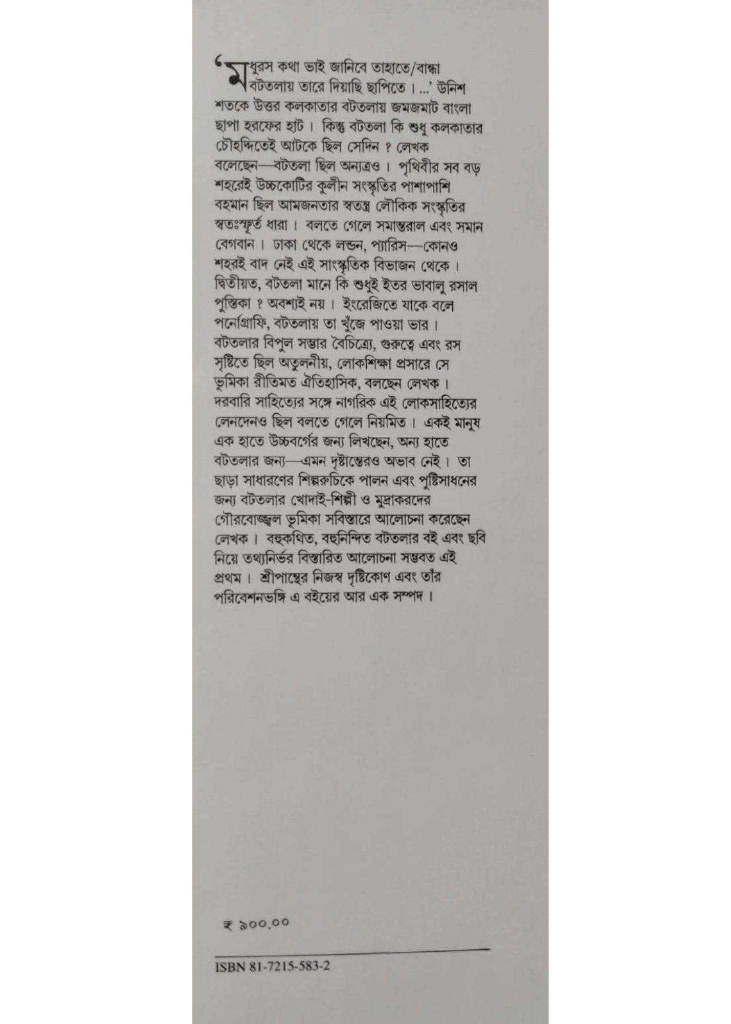 'মধুরস কথা ভাই জানিবে তাহাতে/বান্ধা বটতলায় তারে দিয়াছি ছাপিতে ।...' উনিশ শতকে উত্তর কলকাতার বটতলায় জমজমাট বাংলা ছাপা হরফের হাট। কিন্তু বটতলা কি শুধু কলকাতার চৌহদ্দিতেই আটকে ছিল সেদিন? লেখক বলেছেন- বটতলা ছিল অন্যত্রও। পৃথিবীর সব বড় শহরেই উচ্চকোটির কুলীন সংস্কৃতির পাশাপাশি বহমান ছিল আমজনতার স্বতন্ত্র লৌকিক সংস্কৃতির স্বতঃস্ফূর্ত ধারা। বলতে গেলে সমান্তরাল এবং সমান বেগবান। ঢাকা থেকে লন্ডন, প্যারিস-কোনও শহরই বাদ নেই এই সাংস্কৃতিক বিভাজন থেকে। দ্বিতীয়ত, বটতলা মানে কি শুধুই ইতর ভাবালু রসাল পুস্তিকা? অবশ্যই নয়। ইংরেজিতে যাকে বলে পর্নোগ্রাফি, বটতলায় তা খুঁজে পাওয়া ভার। বটতলার বিপুল সম্ভার বৈচিত্র্যে, গুরুত্বে এবং রস সৃষ্টিতে ছিল অতুলনীয়, লোকশিক্ষা প্রসারে সে ভূমিকা রীতিমত ঐতিহাসিক, বলছেন লেখক। দরবারি সাহিত্যের সঙ্গে নাগরিক এই লোকসাহিত্যের লেনদেনও ছিল বলতে গেলে নিয়মিত। একই মানুষ এক হাতে উচ্চবর্গের জন্য লিখছেন, অন্য হাতে বটতলার জন্য এমন দৃষ্টান্তেরও অভাব নেই। তা ছাড়া সাধারণের শিল্পরুচিকে পালন এবং পুষ্টিসাধনের জন্য বটতলার খোদাই-শিল্পী ও মুদ্রাকরদের গৌরবোজ্জ্বল ভূমিকা সবিস্তারে আলোচনা করেছেন লেখক। বহুকথিত, বহুনিন্দিত বটতলার বই এবং ছবি নিয়ে তথ্যনির্ভর বিস্তারিত আলোচনা সম্ভবত এই প্রথম। শ্রীপান্থের নিজস্ব দৃষ্টিকোণ এবং তাঁর পরিবেশনভঙ্গি এ বইয়ের আর এক সম্পদ।