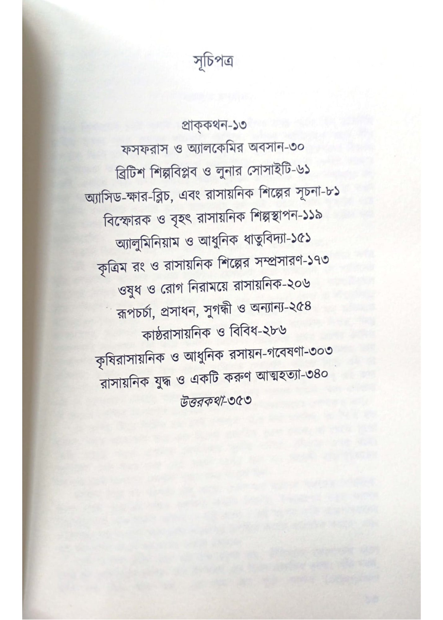 বহুবিধ অজৈব ও জৈব রাসায়নিকের সফল উৎপাদন সম্ভব হয়েছিল রসায়নবিদ ও প্রযুক্তিবিদদের অসাধারণ সৃজনের উদাহরণ হিসাবে। অ্যাসিড-ক্ষার-ব্লিচ-বিস্ফোরক ধাতু রং-ওষুধ নিত্যপ্রয়োজনীয় বস্তু-কৃষির উপযুক্ত সার-কীটনাশক ইত্যাদি যাদের কোনো বাবহার জানা ছিল না মাত্র দুই শতাব্দী আগে হুড়হুড় করে এসে গেল হাতের নাগালের মধ্যে। মানুষের সভ্যতার সংজ্ঞা এরা বদলে দিল বিপুল গতিতে। রসায়নের অগ্রগতির সেই থ্রিলিং ইতিহাস নিয়ে রসেবশে রসায়ন সিরিজের এই দ্বিতীয় বই।