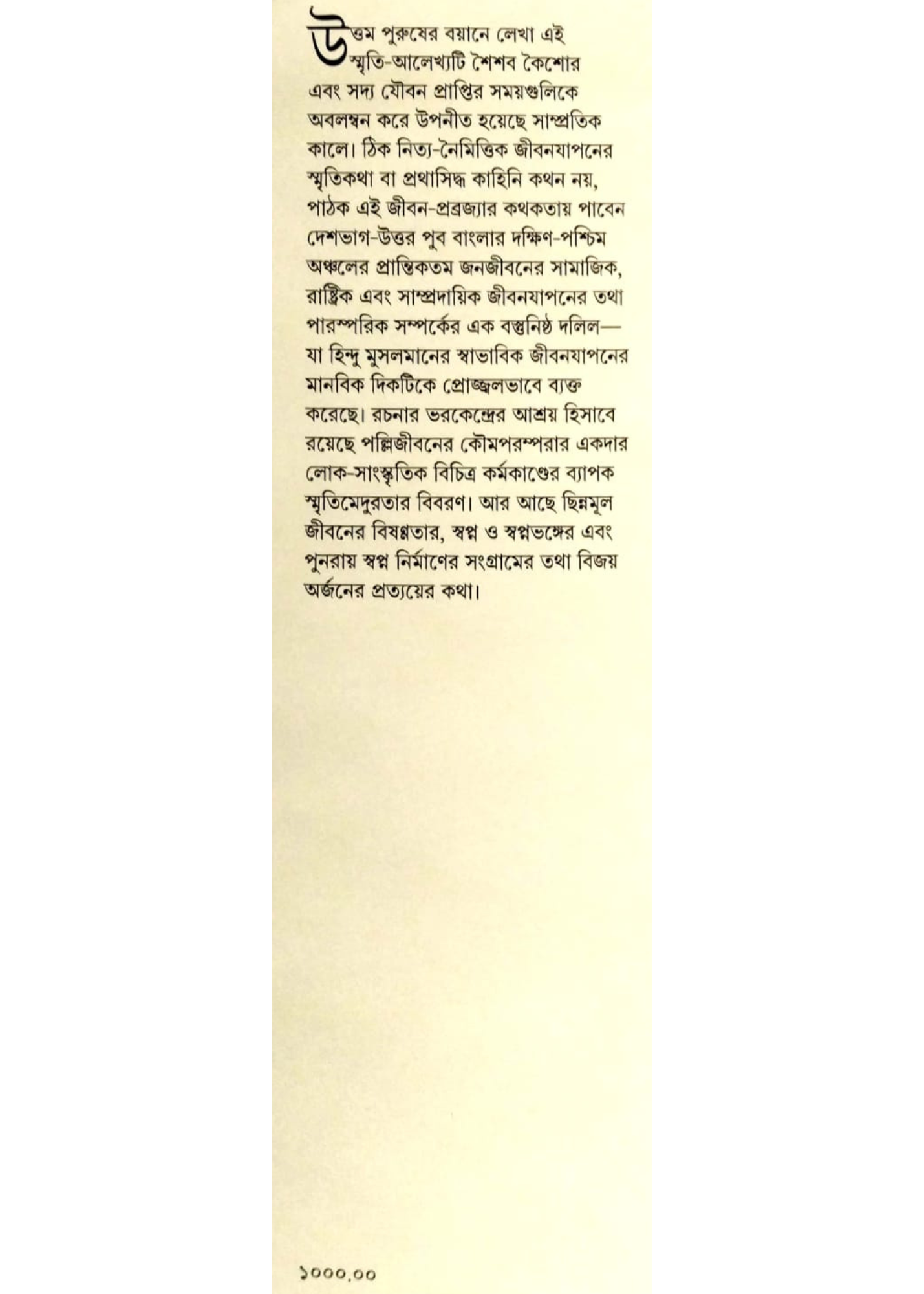 উত্তম পুরুষের বয়ানে লেখা এই স্মৃতি-আলেখ্যটি শৈশব কৈশোর এবং সদ্য যৌবন প্রাপ্তির সময়গুলিকে অবলম্বন করে উপনীত হয়েছে সাম্প্রতিক কালে। ঠিক নিত্য-নৈমিত্তিক জীবনযাপনের স্মৃতিকথা বা প্রথাসিদ্ধ কাহিনি কথন নয়, পাঠক এই জীবন-প্রব্রজ্যার কথকতায় পাবেন দেশভাগ-উত্তর পুব বাংলার দক্ষিণ-পশ্চিম অঞ্চলের প্রান্তিকতম জনজীবনের সামাজিক, রাষ্ট্রিক এবং সাম্প্রদায়িক জীবনযাপনের তথা পারস্পরিক সম্পর্কের এক বস্তুনিষ্ঠ দলিল- যা হিন্দু মুসলমানের স্বাভাবিক জীবনযাপনের মানবিক দিকটিকে প্রোজ্জ্বলভাবে ব্যক্ত করেছে। রচনার ভরকেন্দ্রের আশ্রয় হিসাবে রয়েছে পল্লিজীবনের কৌমপরম্পরার একদার লোক-সাংস্কৃতিক বিচিত্র কর্মকাণ্ডের ব্যাপক স্মৃতিমেদুরতার বিবরণ। আর আছে ছিন্নমূল জীবনের বিষণ্ণতার, স্বপ্ন ও স্বপ্নভঙ্গের এবং পুনরায় স্বপ্ন নির্মাণের সংগ্রামের তথা বিজয় অর্জনের প্রত্যয়ের কথা।