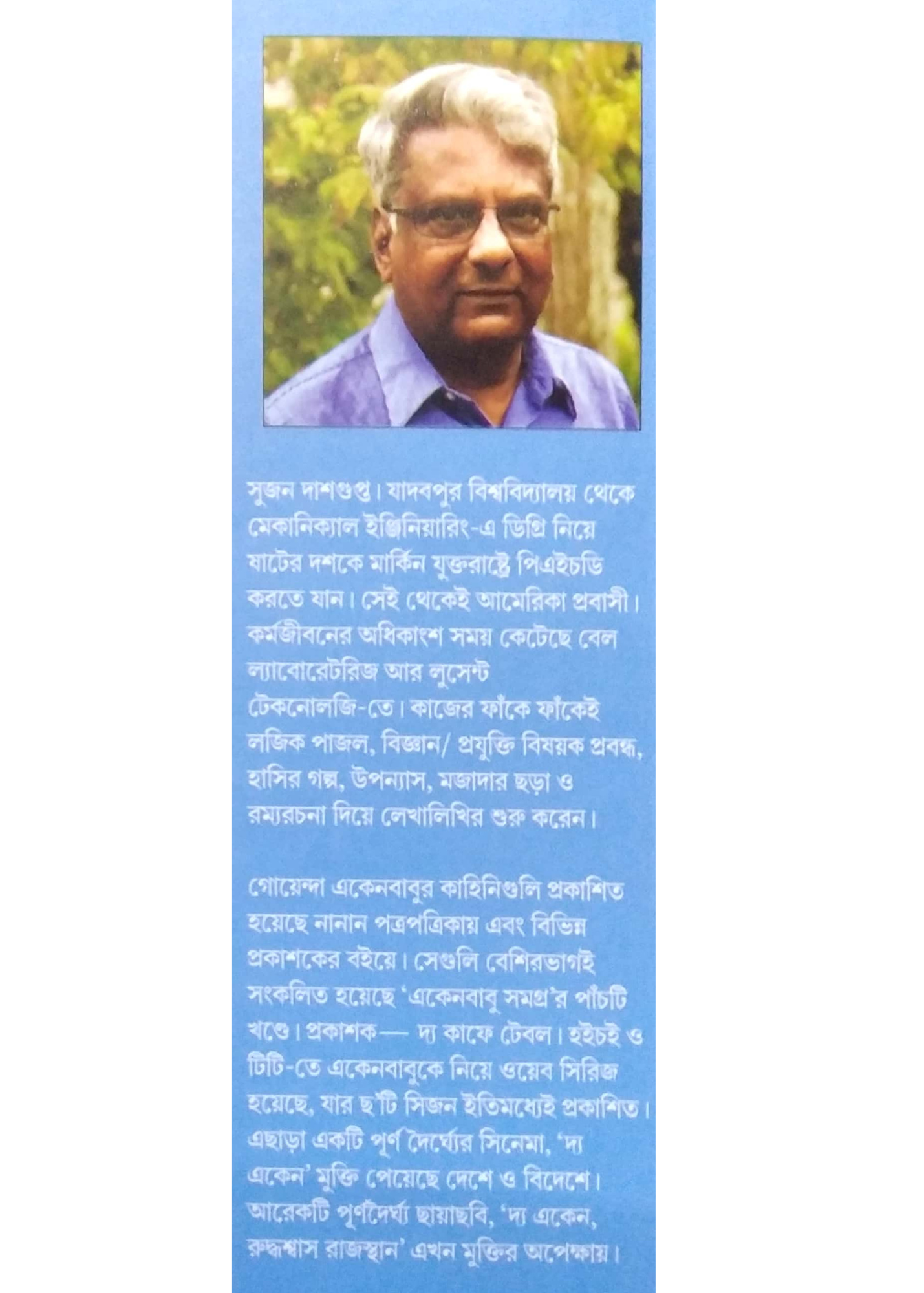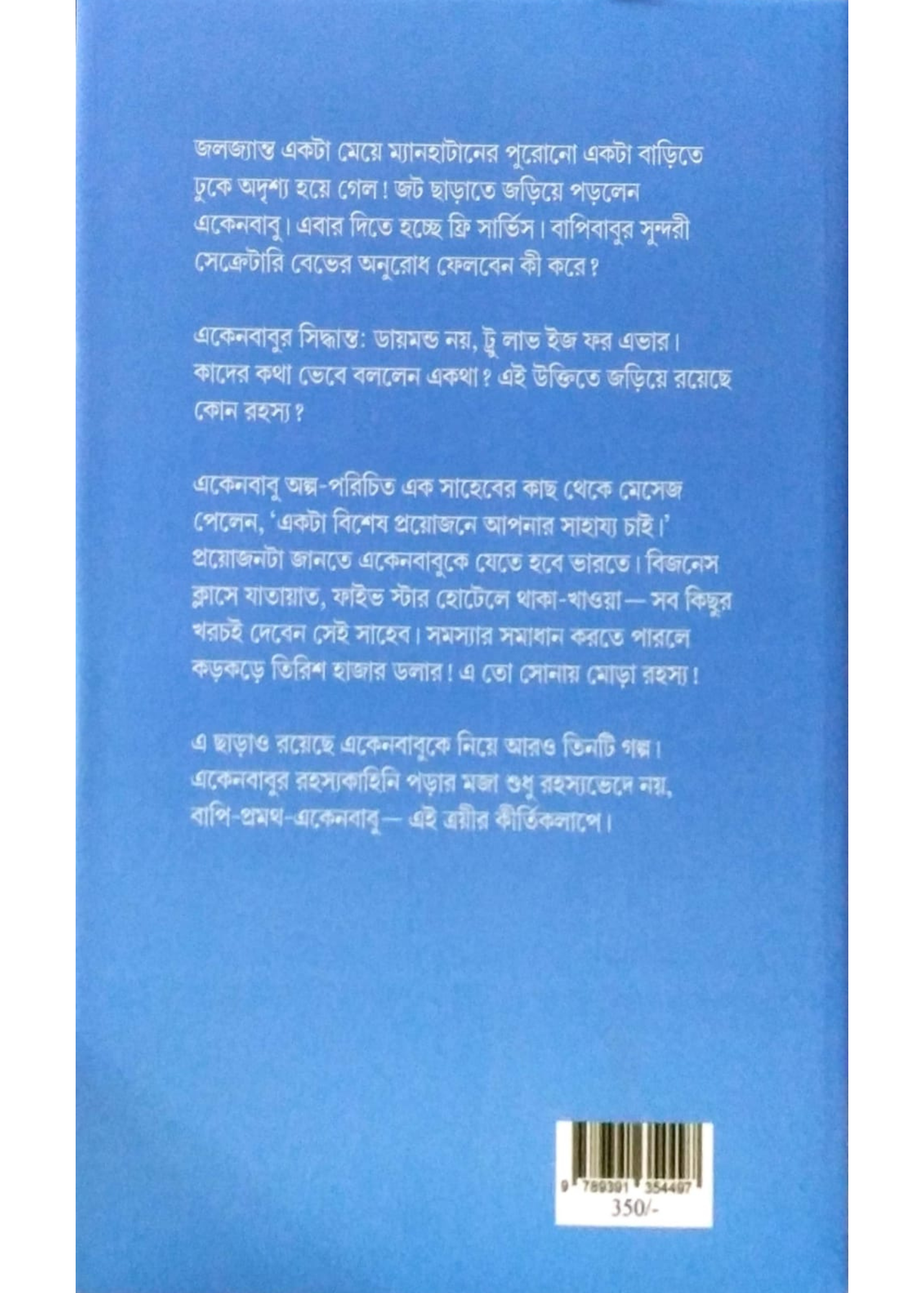 এ ছাড়াও রয়েছে একেনবাবুকে নিয়ে আরও তিনটি গল্প। একেনবাবুর রহস্যকাহিনি পড়ার মজা শুধু রহস্যভেদে নয়, বাপি-প্রমথ-একেনবাবু- এই ত্রয়ীর কীর্তিকলাপে