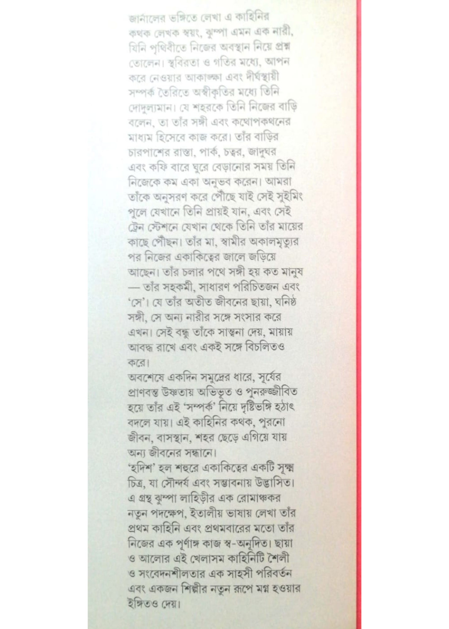 জানালের ভঙ্গিতে লেখা এ কাহিনির কথক লেখক স্বয়ং, ঝুম্পা এমন এক নারী, মিনি পৃথিবীতে নিজের অবস্থান নিয়ে প্রশ্ন তোলেন। স্থবিরতা ও গতির মধ্যে, আপন করে নেওয়ার আকালঙ্কা এবং দীর্ঘস্থায়ী সম্পর্ক তৈরিতে অস্বীকৃতির মধ্যে তিনি দোদুল্যমান। যে শহরকে তিনি নিজের বাড়ি বলেন, তা তাঁর সঙ্গী এবং কথোপকথনের মাধ্যম হিসেবে কাজ করে। তাঁর বাড়ির চারপাশের রাস্তা, পার্ক, চত্বর, জাদুঘর এবং কফি বারে ঘুরে বেড়ানোর সময় তিনি নিজেকে কম একা অনুভব করেন। আমরা তাঁকে অনুসরণ করে পৌঁছে যাই সেই সুইমিং পুলে যেখানে তিনি প্রায়ই যান, এবং সেই ট্রেন স্টেশনে যেখান থেকে তিনি তাঁর মায়ের কাছে পৌঁছন। তাঁর মা, স্বামীর অকালমৃত্যুর পর নিজের একাকিত্বের জালে জড়িয়ে আছেন। তাঁর চলার পথে সঙ্গী হয় কত মানুষ তাঁর সহকর্মী, সাধারণ পরিচিতজন এবং 'সে'। যে তাঁর অতীত জীবনের ছায়া, ঘনিষ্ঠ সঙ্গী, সে অন্য নারীর সঙ্গে সংসার করে এখন। সেই বন্ধু তাঁকে সান্ত্বনা দেয়, মায়ায় আবদ্ধ রাখে এবং একই সঙ্গে বিচলিতও