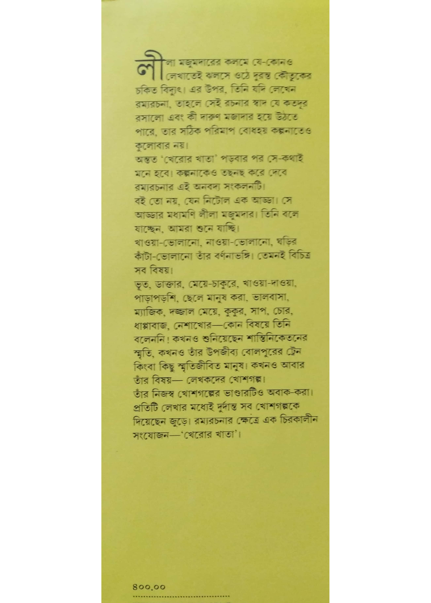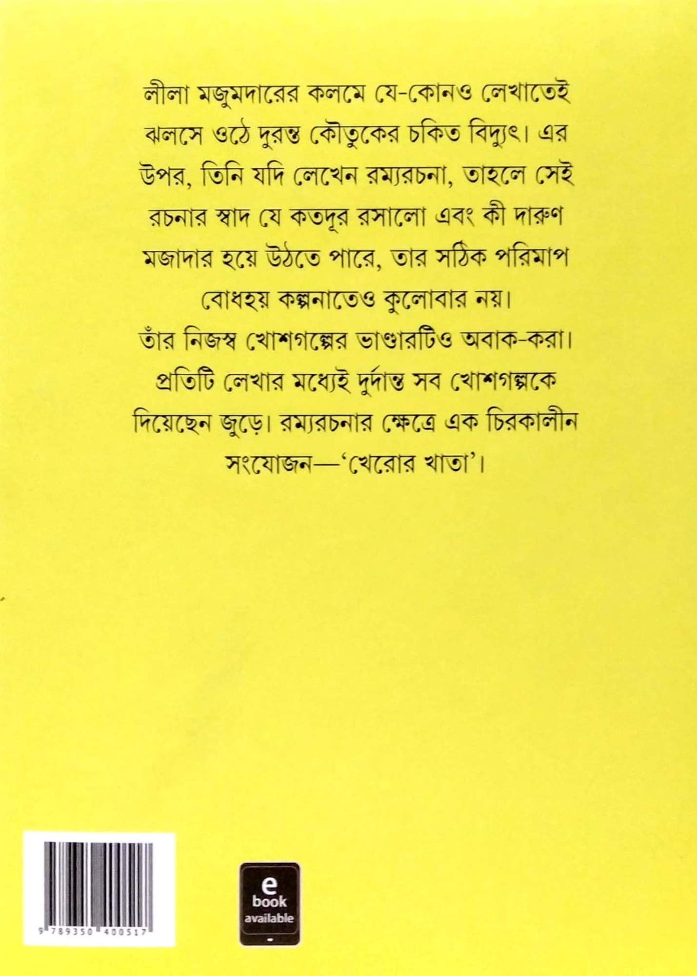 লীলা মজুমদারের কলমে যে-কোনও লেখাতেই ঝলসে ওঠে দুরন্ত কৌতুকের চকিত বিদ্যুৎ। এর উপর, তিনি যদি লেখেন রম্যরচনা, তাহলে সেই রচনার স্বাদ যে কতদূর রসালো এবং কী দারুণ মজাদার হয়ে উঠতে পারে, তার সঠিক পরিমাপ বোধহয় কল্পনাতেও কুলোবার নয়। অন্তত 'খেরোর খাতা' পড়বার পর সে-কথাই মনে হবে। কল্পনাকেও তছনছ করে দেবে রম্যরচনার এই অনবদ্য সংকলনটি। বই তো নয়, যেন নিটোল এক আড্ডা। সে আড্ডার মধ্যমণি লীলা মজুমদার। তিনি বলে যাচ্ছেন, আমরা শুনে যাচ্ছি। খাওয়া-ভোলানো, নাওয়া-ভোলানো, ঘড়ির কাঁটা-ভোলানো তাঁর বর্ণনাভঙ্গি। তেমনই বিচিত্র সব বিষয়। ভূত, ডাক্তার, মেয়ে-চাকুরে, খাওয়া-দাওয়া, পাড়াপড়শি, ছেলে মানুষ করা, ভালবাসা, ম্যাজিক, দজ্জাল মেয়ে, কুকুর, সাপ, চোর, ধাপ্পাবাজ, নেশাখোর-কোন বিষয়ে তিনি বলেননি। কখনও শুনিয়েছেন শান্তিনিকেতনের স্মৃতি, কখনও তাঁর উপজীব্য বোলপুরের ট্রেন কিংবা কিছু স্মৃতিজীবিত মানুষ। কখনও আবার তাঁর বিষয়- লেখকদের খোশগল্প। তাঁর নিজস্ব খোশগল্পের ভাণ্ডারটিও অবাক-করা। প্রতিটি লেখার মধ্যেই দুর্দান্ত সব খোশগল্পকে দিয়েছেন জুড়ে। রম্যরচনার ক্ষেত্রে এক চিরকালীন সংযোজন- 'খেরোর খাতা'।