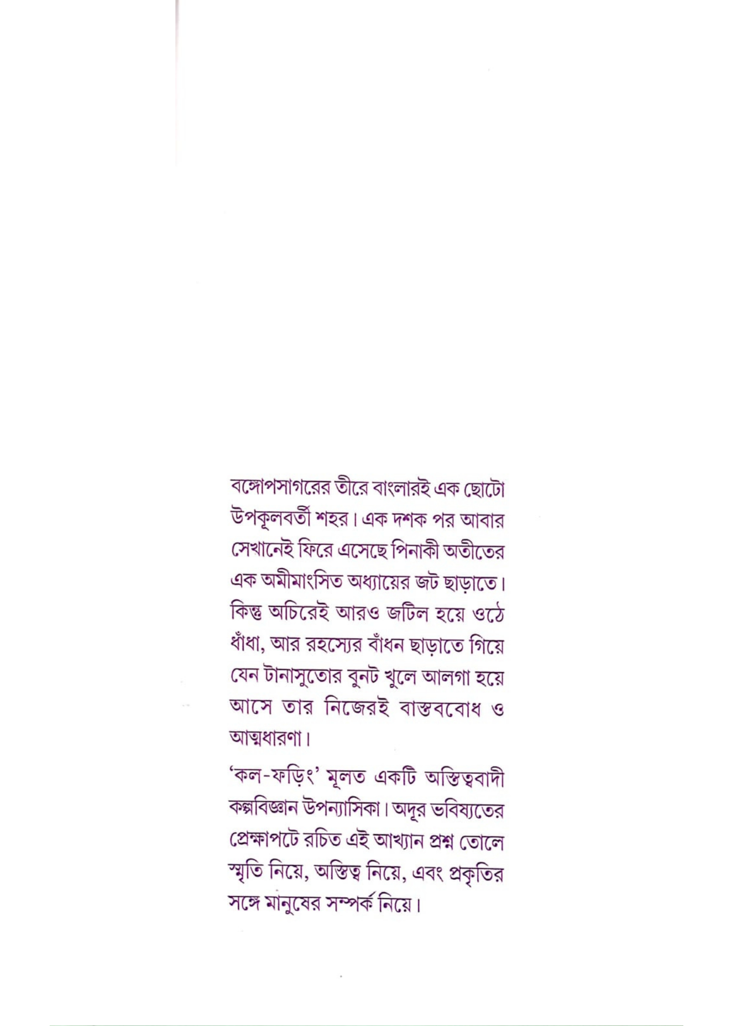 বঙ্গোপসাগরের তীরে বাংলারই এক ছোটো উপকূলবর্তী শহর। এক দশক পর আবার সেখানেই ফিরে এসেছে পিনাকী অতীতের এক অমীমাংসিত অধ্যায়ের জট ছাড়াতে। কিন্তু অচিরেই আরও জটিল হয়ে ওঠে ধাঁধা, আর রহস্যের বাঁধন ছাড়াতে গিয়ে যেন টানাসুতোর বুনট খুলে আলগা হয়ে আসে তার নিজেরই বাস্তববোধ ও আত্মধারণা।