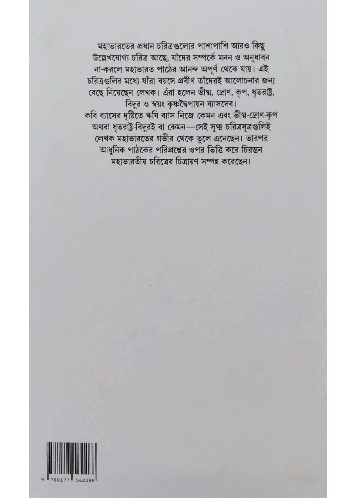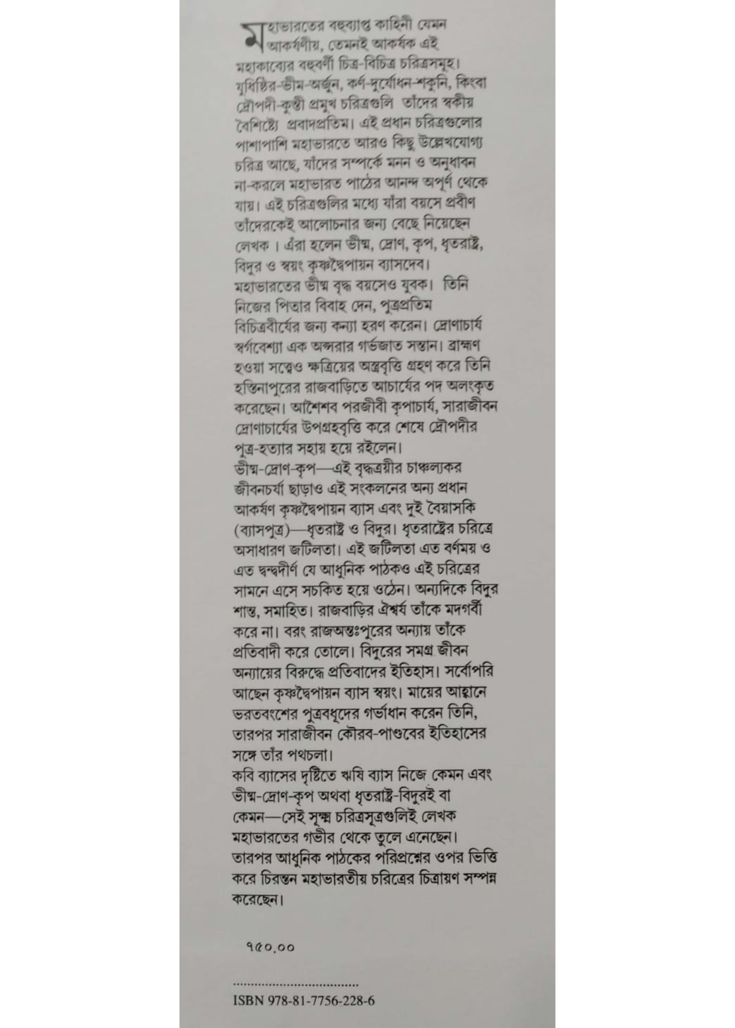 মহাভারতের প্রধান চরিত্রগুলোর পাশাপাশি আরও কিছু উল্লেখযোগ্য চরিত্র আছে, যাঁদের সম্পর্কে মনন ও অনুধাবন না-করলে মহাভারত পাঠের আনন্দ অপূর্ণ থেকে যায়। এই চরিত্রগুলির মধ্যে যাঁরা বয়সে প্রবীণ তাঁদেরই আলোচনার জন্য বেছে নিয়েছেন লেখক। এঁরা হলেন ভীষ্ম, দ্রোণ, কৃপ, ধৃতরাষ্ট্র, বিদুর ও স্বয়ং কৃষ্ণদ্বৈপায়ন ব্যাসদেব।