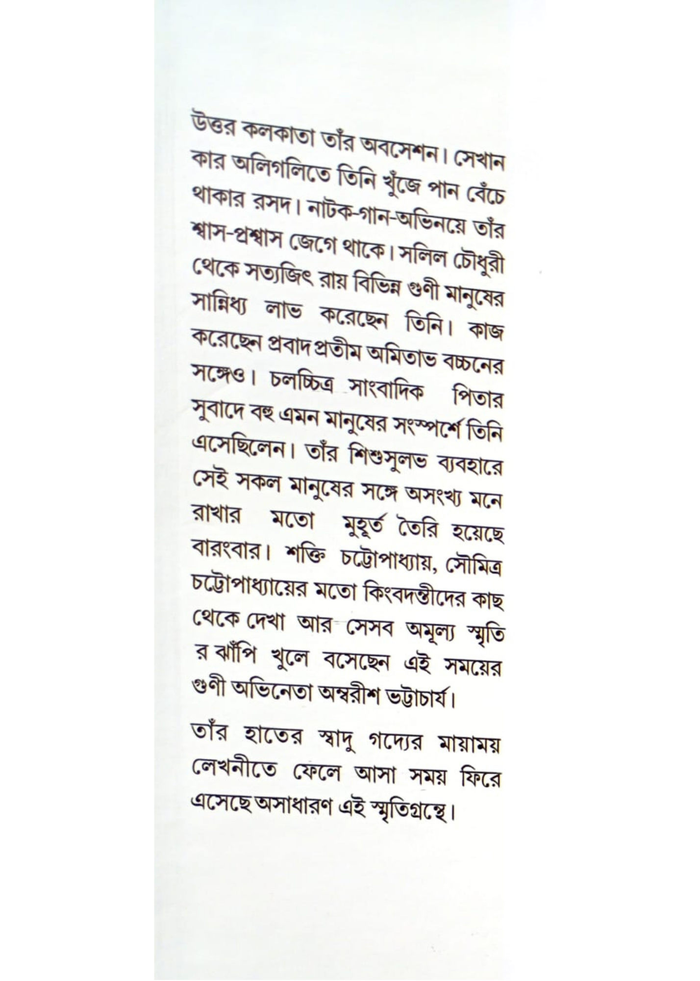 উত্তর কলকাতা তাঁর অবসেশন। সেখান কার অলিগলিতে তিনি খুঁজে পান বেঁচে থাকার রসদ। নাটক-গান-অভিনয়ে তাঁর শ্বাস-প্রশ্বাস জেগে থাকে। সলিল চৌধুরী থেকে সত্যজিৎ রায় বিভিন্ন গুণী মানুষের সান্নিধ্য লাভ করেছেন তিনি। কাজ করেছেন প্রবাদ প্রতীম অমিতাভ বচ্চনের সঙ্গেও। চলচ্চিত্র সাংবাদিক পিতার সুবাদে বহু এমন মানুষের সংস্পর্শে তিনি এসেছিলেন। তাঁর শিশুসুলভ ব্যবহারে সেই সকল মানুষের সঙ্গে অসংখ্য মনে রাখার মতো মুহূর্ত তৈরি হয়েছে বারংবার। শক্তি চট্টোপাধ্যায়, সৌমিত্র চট্টোপাধ্যায়ের মতো কিংবদন্তীদের কাছ থেকে দেখা আর সেসব অমূল্য স্মৃতি র ঝাঁপি খুলে বসেছেন এই সময়ের গুণী অভিনেতা অম্বরীশ ভট্টাচার্য।
