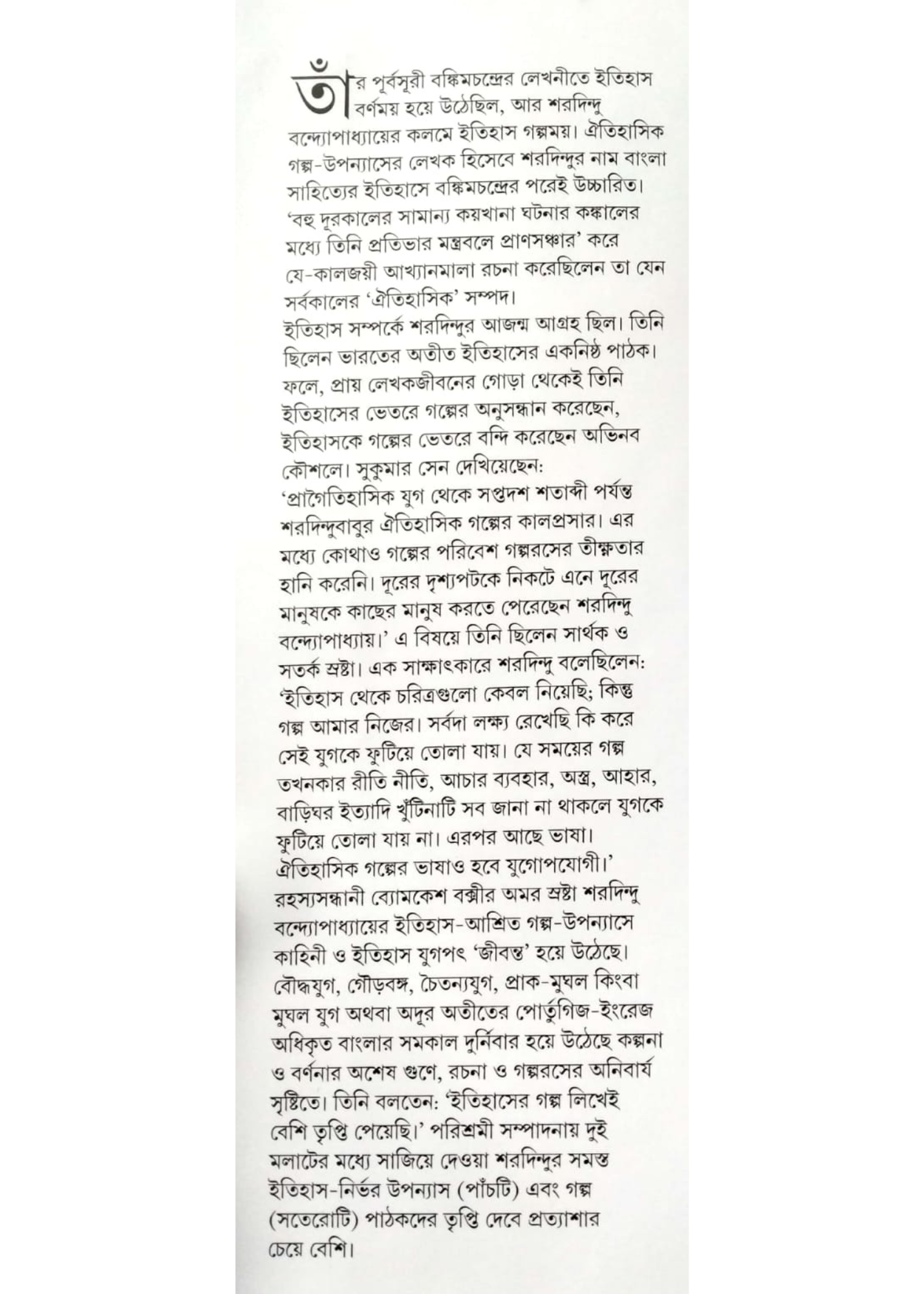 তার পূর্বসূরী বঙ্কিমচন্দ্রের লেখনীতে ইতিহাস বর্ণময় হয়ে উঠেছিল, আর শরদিন্দু বন্দ্যোপাধ্যায়ের কলমে ইতিহাস গল্পময়। ঐতিহাসিক গল্প-উপন্যাসের লেখক হিসেবে শরদিন্দুর নাম বাংলা সাহিত্যের ইতিহাসে বঙ্কিমচন্দ্রের পরেই উচ্চারিত। 'বহু দূরকালের সামান্য কয়খানা ঘটনার কঙ্কালের মধ্যে তিনি প্রতিভার মন্ত্রবলে প্রাণসঞ্চার' করে যে-কালজয়ী আখ্যানমালা রচনা করেছিলেন তা যেন সর্বকালের 'ঐতিহাসিক' সম্পদ। ইতিহাস সম্পর্কে শরদিন্দুর আজন্ম আগ্রহ ছিল। তিনি