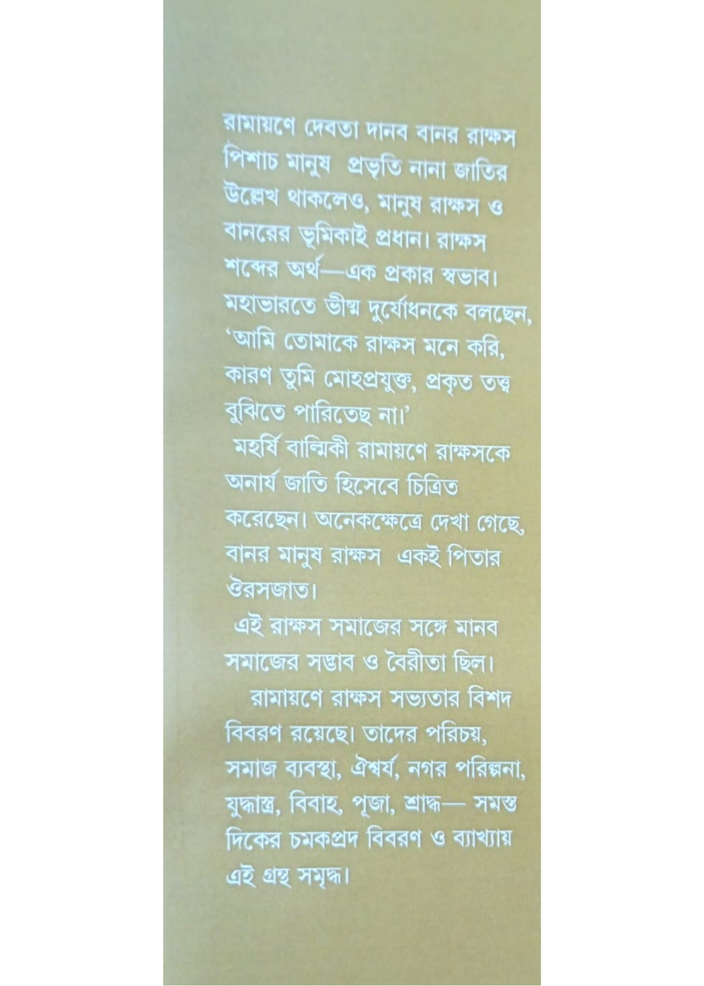 রামায়ণে রাক্ষস সভ্যতার বিশদ বিবরণ রয়েছে। তাদের পরিচয়, সমাজ ব্যবস্থা, ঐশ্বর্য, নগর পরিল্পনা, যুদ্ধাস্ত্র, বিবাহ, পূজা, শ্রাদ্ধ-সমস্ত দিকের চমকপ্রদ বিবরণ ও ব্যাখ্যায় এই গ্রন্থ সমৃদ্ধ।