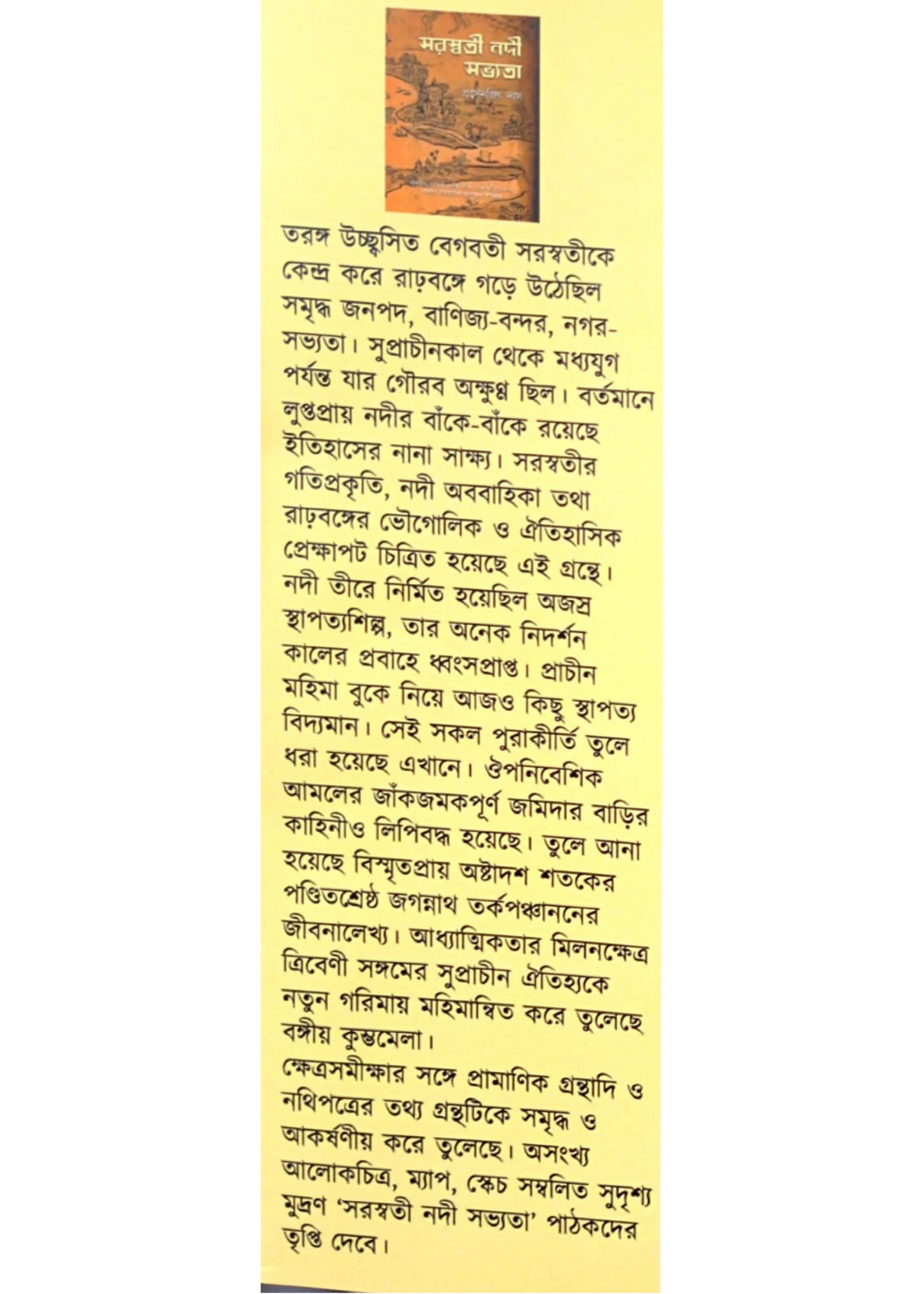 তরঙ্গ উচ্ছ্বসিত বেগবতী সরস্বতীকে কেন্দ্র করে রাঢ়বঙ্গে গড়ে উঠেছিল সমৃদ্ধ জনপদ, বাণিজ্য-বন্দর, নগর-সভ্যতা। সুপ্রাচীনকাল থেকে মধ্যযুগ পর্যন্ত যার গৌরব অক্ষুণ্ণ ছিল। বর্তমানে লুপ্তপ্রায় নদীর বাঁকে-বাঁকে রয়েছে ইতিহাসের নানা সাক্ষ্য। সরস্বতীর গতিপ্রকৃতি, নদী অববাহিকা তথা রাঢ়বঙ্গের ভৌগোলিক ও ঐতিহাসিক প্রেক্ষাপট চিত্রিত হয়েছে এই গ্রন্থে। নদী তীরে নির্মিত হয়েছিল অজস্র স্থাপত্যশিল্প, তার অনেক নিদর্শন কালের প্রবাহে ধ্বংসপ্রাপ্ত। প্রাচীন মহিমা বুকে নিয়ে আজও কিছু স্থাপত্য বিদ্যমান। সেই সকল পুরাকীর্তি তুলে ধরা হয়েছে এখানে। ঔপনিবেশিক আমলের জাঁকজমকপূর্ণ জমিদার বাড়ির কাহিনীও লিপিবদ্ধ হয়েছে। তুলে আনা হয়েছে বিস্মৃতপ্রায় অষ্টাদশ শতকের পণ্ডিতশ্রেষ্ঠ জগন্নাথ তর্কপঞ্চাননের জীবনালেখ্য। আধ্যাত্মিকতার মিলনক্ষেত্র ত্রিবেণী সঙ্গমের সুপ্রাচীন ঐতিহ্যকে নতুন গরিমায় মহিমান্বিত করে তুলেছে বঙ্গীয় কুম্ভমেলা।