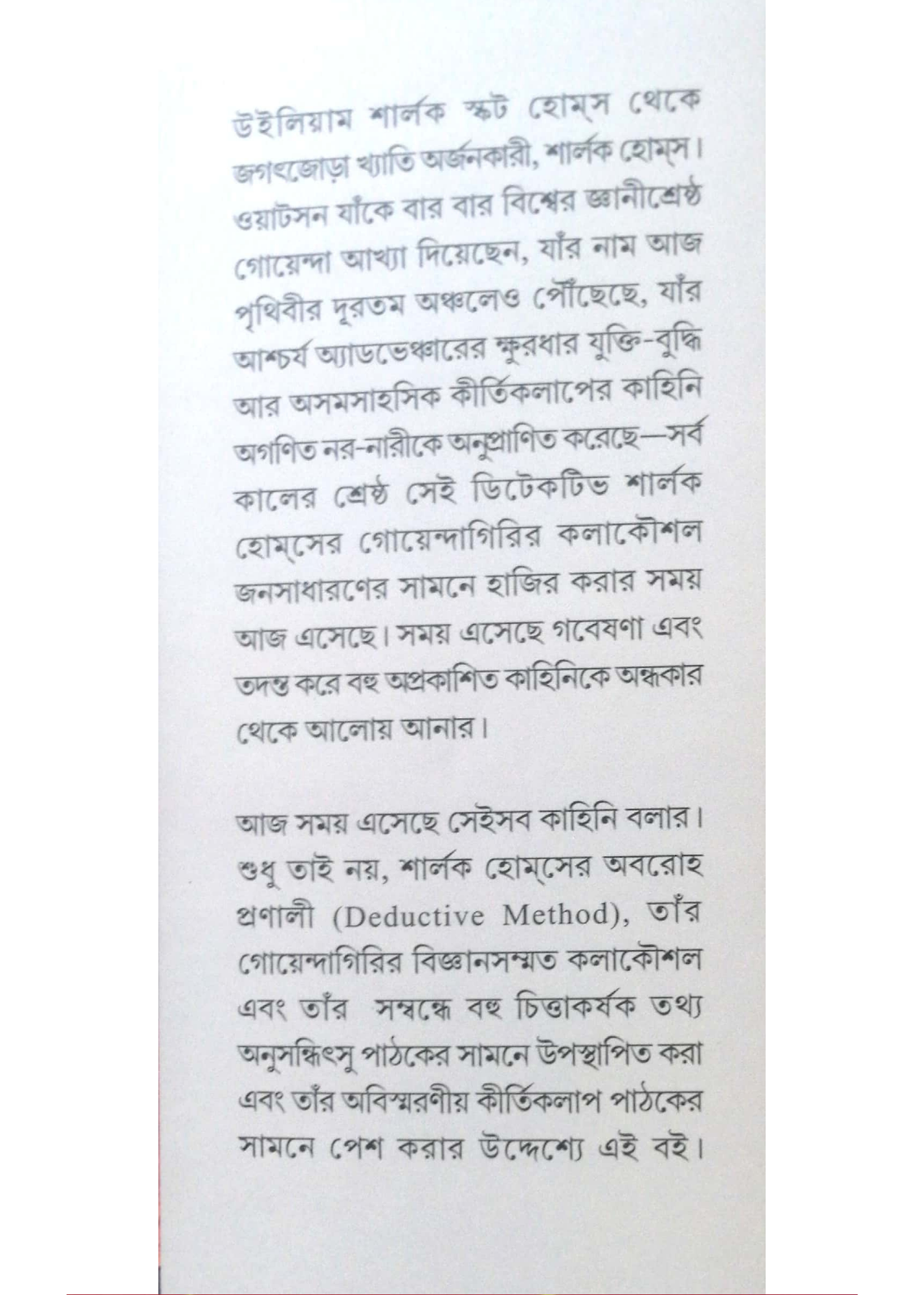 থেকে আলোয় আনার।আজ সময় এসেছে সেইসব কাহিনি বলার। শুধু তাই নয়, শার্লক হোমসের অবরোহ প্রণালী (Deductive Method), তাঁর গোয়েন্দাগিরির বিজ্ঞানসম্মত কলাকৌশল এবং তাঁর সম্বন্ধে বহু চিত্তাকর্ষক তথ্য অনুসন্ধিৎসু পাঠকের সামনে উপস্থাপিত করা এবং তাঁর অবিস্মরণীয় কীর্তিকলাপ পাঠকের সামনে পেশ করার উদ্দেশ্যে এই বই।