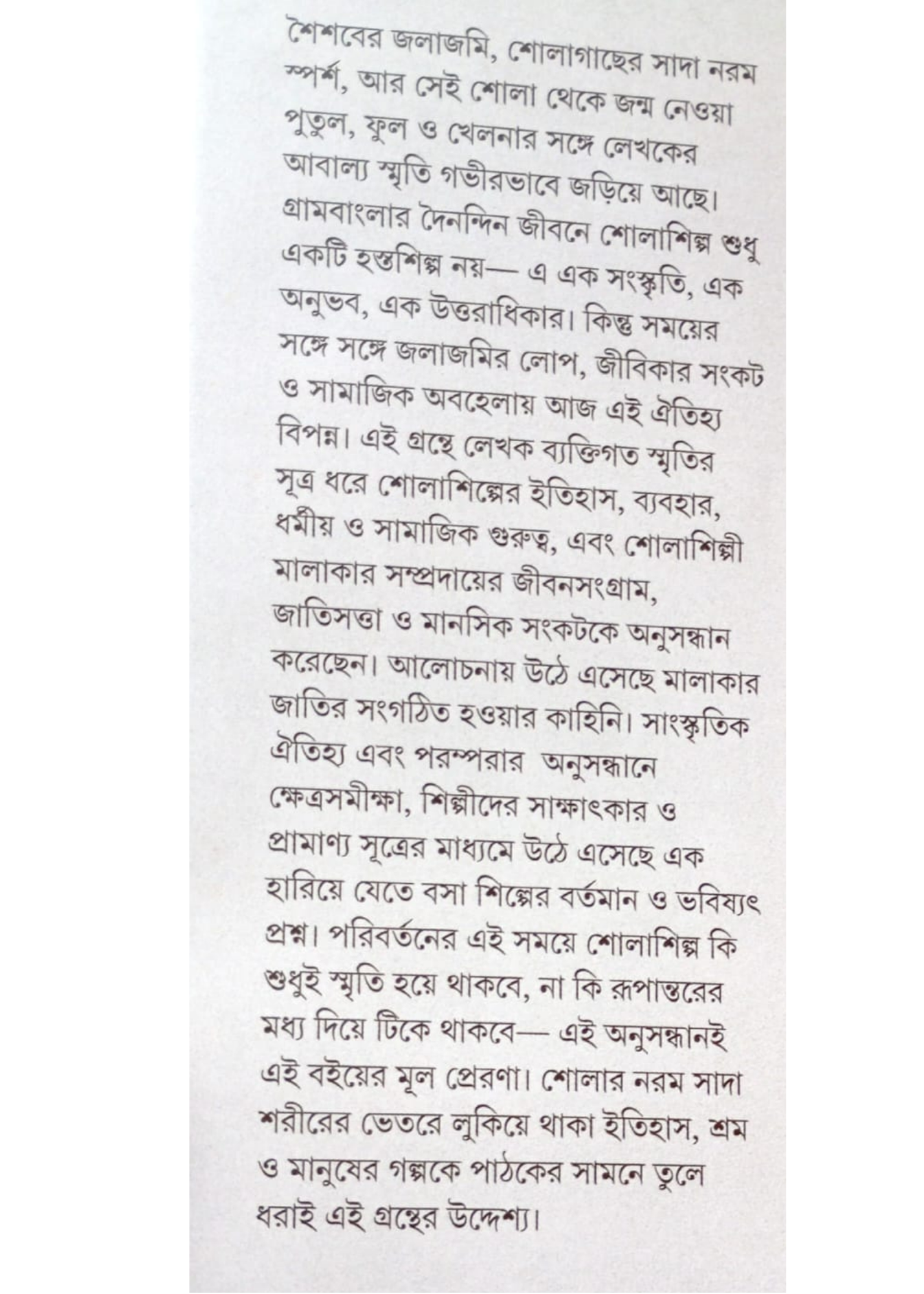পরিবর্তনের সময়ে শোলাশিল্প কি শুধুই স্মৃতি হয়ে থাকবে, না কি রূপান্তরের মধ্য দিয়ে টিকে থাকবে- এই অনুসন্ধানই এই বইয়ের মূল প্রেরণা। শোলার নরম সাদা শরীরের ভেতরে লুকিয়ে থাকা ইতিহাস, শ্রম ও মানুষের গল্পকে পাঠকের সামনে তুলে ধরাই এই গ্রন্থের উদ্দেশ্য।