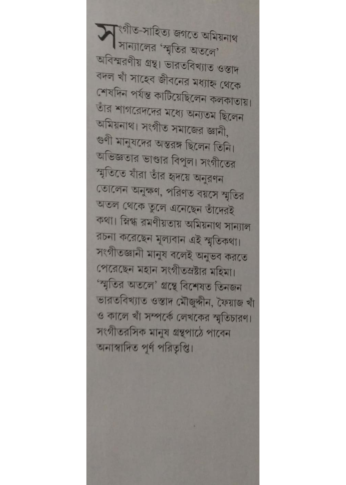 সংগীত-সাহিত্য জগতে অমিয়নাথ সান্যালের 'স্মৃতির অতলে' অবিস্মরণীয় গ্রন্থ। ভারতবিখ্যাত ওস্তাদ বদল খাঁ সাহেব জীবনের মধ্যাহ্ন থেকে শেষদিন পর্যন্ত কাটিয়েছিলেন কলকাতায়। তাঁর শাগরেদদের মধ্যে অন্যতম ছিলেন অমিয়নাথ। সংগীত সমাজের জ্ঞানী, গুণী মানুষদের অন্তরঙ্গ ছিলেন তিনি। অভিজ্ঞতার ভাণ্ডার বিপুল। সংগীতের স্মৃতিতে যাঁরা তাঁর হৃদয়ে অনুরণন তোলেন অনুক্ষণ, পরিণত বয়সে স্মৃতির অতল থেকে তুলে এনেছেন তাঁদেরই কথা। স্নিগ্ধ রমণীয়তায় অমিয়নাথ সান্যাল রচনা করেছেন মূল্যবান এই স্মৃতিকথা। সংগীতজ্ঞানী মানুষ বলেই অনুভব করতে পেরেছেন মহান সংগীতস্রষ্টার মহিমা। 'স্মৃতির অতলে' গ্রন্থে বিশেষত তিনজন ভারতবিখ্যাত ওস্তাদ মৌজুদ্দীন, ফৈয়াজ খাঁ ও কালে খাঁ সম্পর্কে লেখকের স্মৃতিচারণ। সংগীতরসিক মানুষ গ্রন্থপাঠে ।