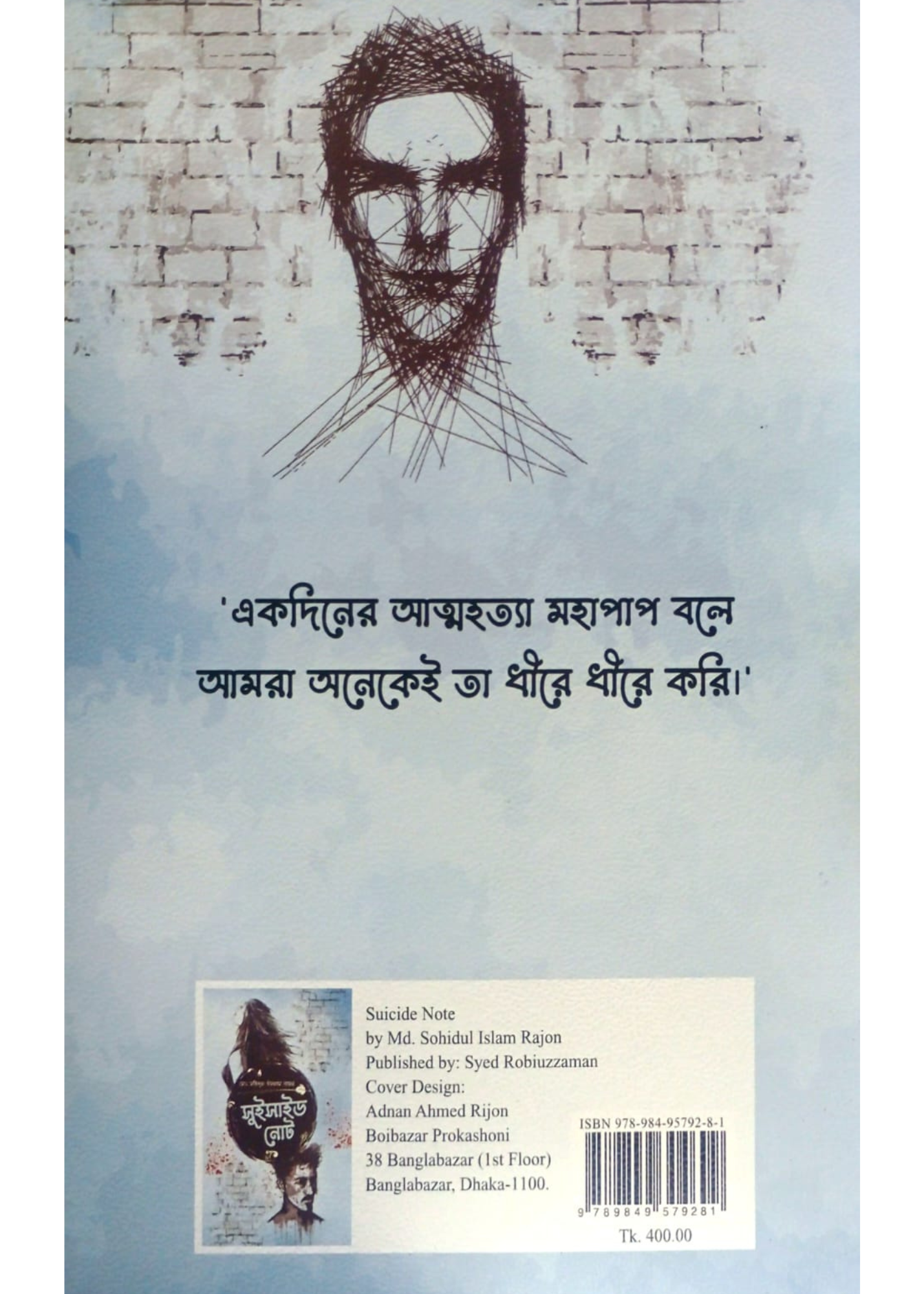 রোমান্টিক থ্রিলার সুইসাইড নোট শ্রাবন এবং চারদেয়ালের মাঝে আটকে থাকা অসহায় এক মায়ের গল্প। সুইসাইড নোট ঝুমুর নামক এক প্রাণবন্ত কিশোরীর গল্প। সুইসাইড নোট আমি এবং আমাদের গল্প।