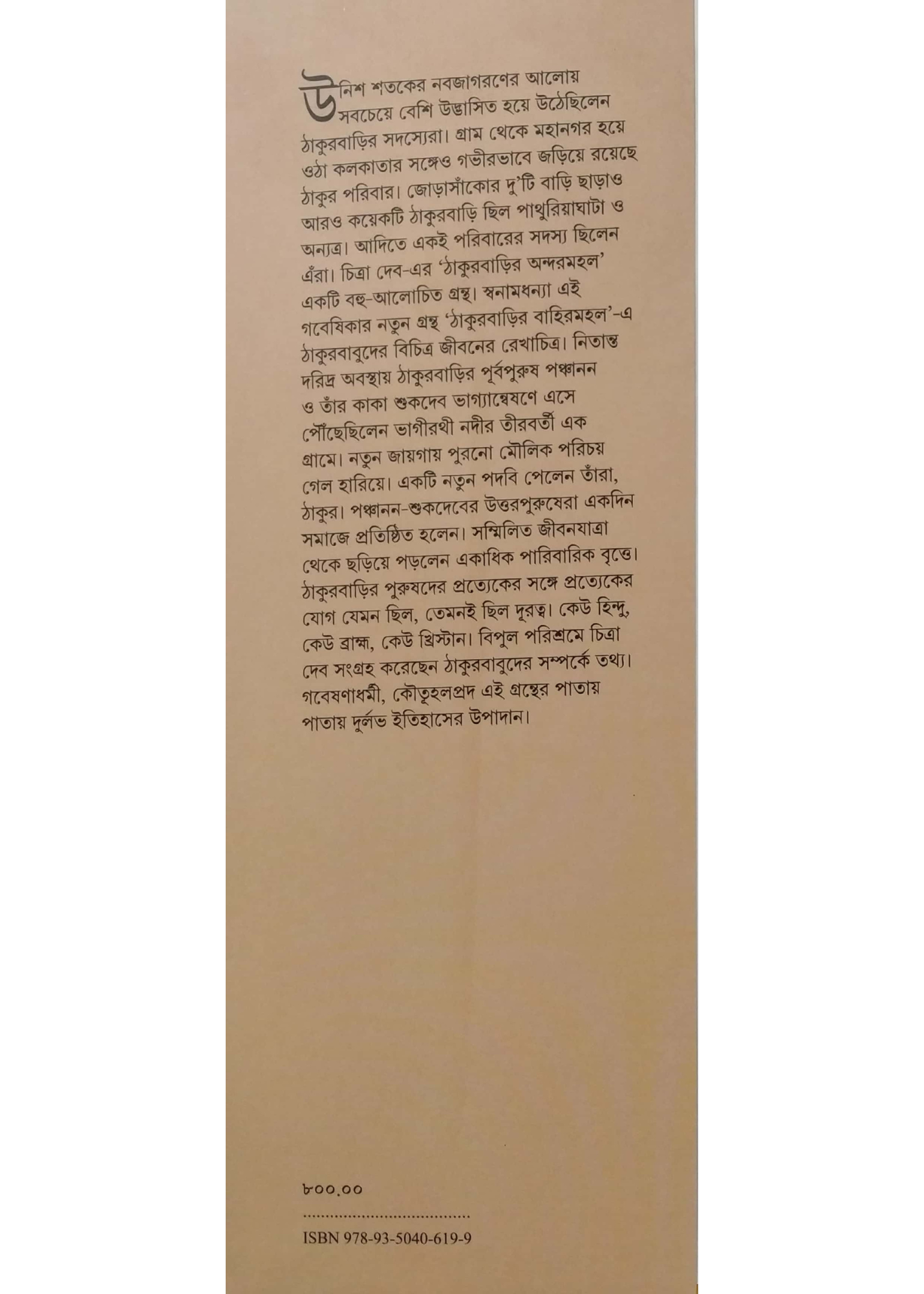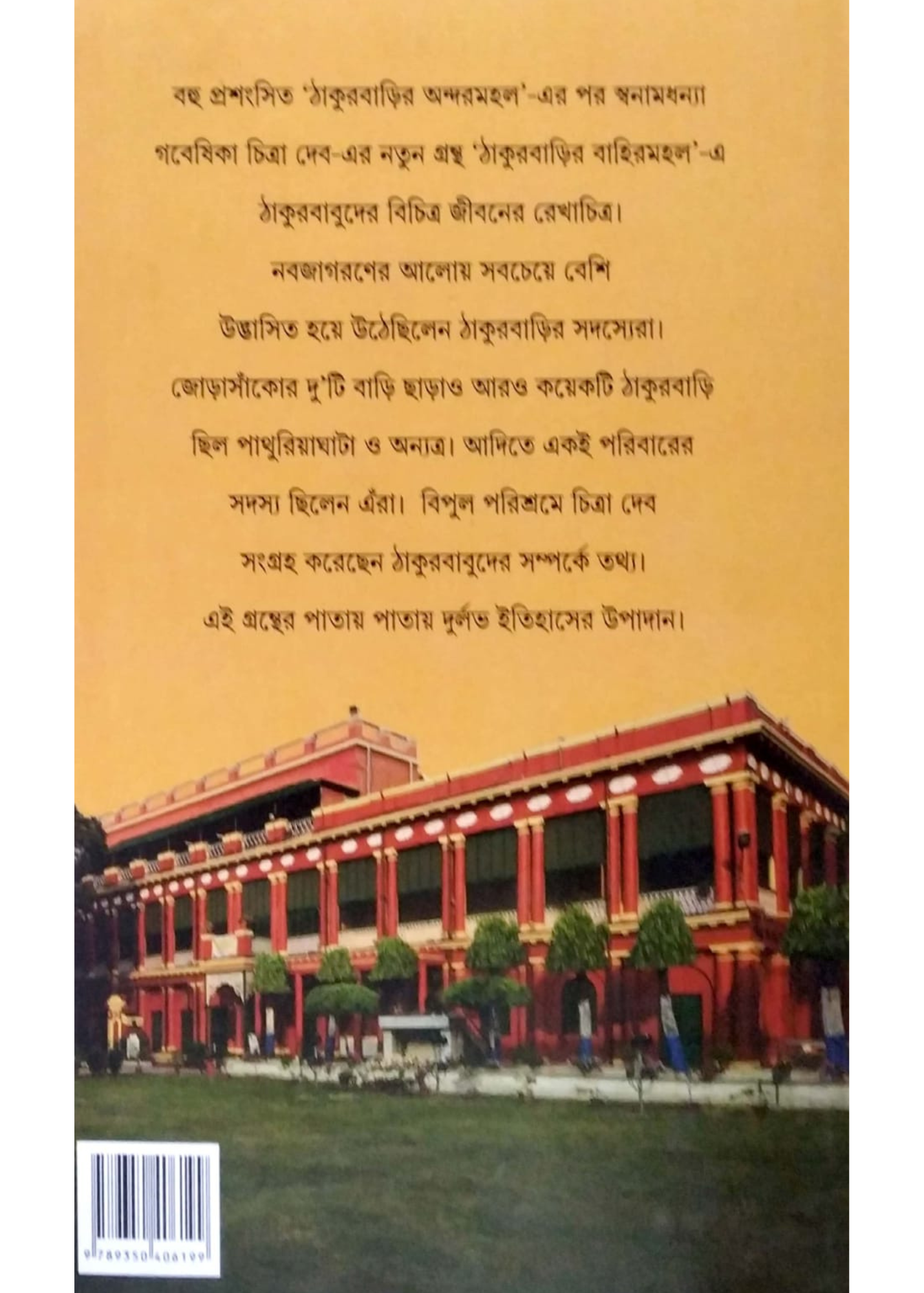 বহু প্রশংসিত 'ঠাকুরবাড়ির অন্দরমহল'-এর পর স্বনামধন্যা গবেষিকা চিত্রা দেব-এর নতুন গ্রন্থ 'ঠাকুরবাড়ির বাহিরমহল'-এ ঠাকুরবাবুদের বিচিত্র জীবনের রেখাচিত্র। নবজাগরণের আলোয় সবচেয়ে বেশি উদ্ভাসিত হয়ে উঠেছিলেন ঠাকুরবাড়ির সদস্যেরা। জোড়াসাঁকোর দু'টি বাড়ি ছাড়াও আরও কয়েকটি ঠাকুরবাড়ি ছিল পাথুরিয়াঘাটা ও অন্যত্র। আদিতে একই পরিবারের সদস্য ছিলেন এঁরা। বিপুল পরিশ্রমে চিত্রা দেব সংগ্রহ করেছেন ঠাকুরবাবুদের সম্পর্কে তথ্য। এই গ্রন্থের পাতায় পাতায় দুর্লভ ইতিহাসের উপাদান।