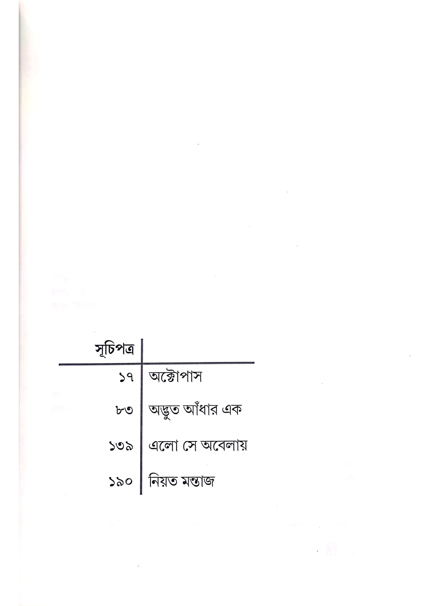 সময়ের ফলকে উৎকীর্ণ উপন্যাস, যা গোটা জীবন ধরে কবি শামসুর রাহমান লিখে ছিলেন সময়কে ধারণ করবার আন্তরিক উদ্যোগে, তা-ই প্রথিত হয়েছে এই গ্রন্থে। 'অক্টোপাস', যে সামুদ্রিক জীব জলেই আঁকড়ে ধরে জীবনকে, যে জীবন মৃত্যুর চেয়েও বড়, জীবনের থেকেও মহৎ, সেই না ছেড়ে যাওয়া জীবনকে আকীর্ণ করে বাঙালি জীবনের এক ক্রান্তিকালপর্ব এই গ্রন্থে শামসুরের ছোট ছোট উপন্যাসগুলিতে খোদাই করা আছে। জীবনকে শামসুর অনুভব করেছিলেন বেঁচে থাকবার এক অসীম অনন্ত আকাশ হিসেবে, যে আকাশে হোমাপাখি এক অনন্ত জীবনের জয়গান গেয়েই চলে, গেয়েই চলে। সেই গান কখনও বিহঙ্গের ডানাকে অবরুদ্ধ চেতনায় স্থিত করে না; বলে, বলেই চলে ওরে বিহঙ্গ, তবু বিহঙ্গ মোর, এখনই অন্ধ বন্ধ করো না পাখা। আহত পাখির মতো ডানা ঝাপটিয়েও যে পাখি নিঃসীম ঘন নীল অম্বরে পাখা মেলে নীল কপোতাক্ষির জয়গান গায় এই উপাখ্যানমালা তারই বেঁচে থাকার পবিত্র জায়নামাজ।